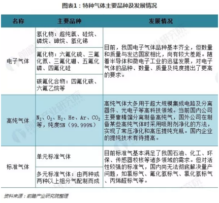 目前,從應(yīng)用領(lǐng)域劃分,特種氣體主要有電子氣體、高純氣體、標準氣體三種,具體品種及發(fā)展情況如下。